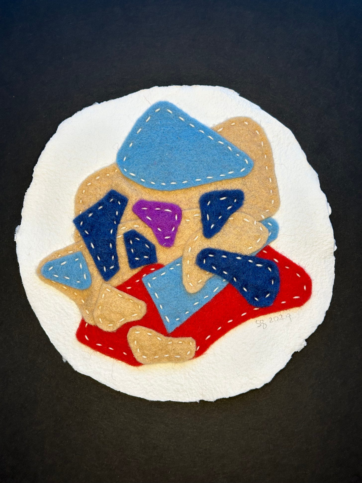 Happy Scrappy #7, 2024, Felt & Sashiko Thread on Handcrafted Paper. 6 inches round.