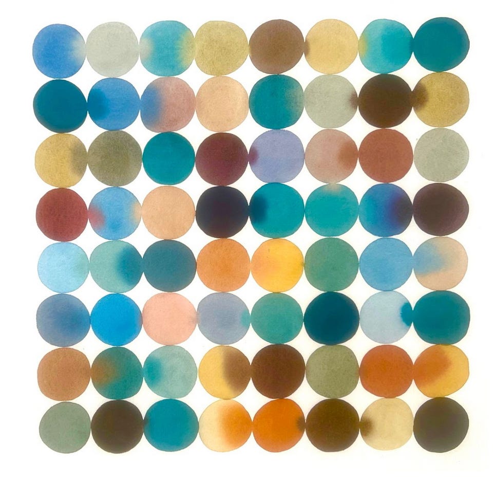 Tansy Hargan creates luminous fields of repeated forms that feel both cellular and cosmic — disciplined and alive. The grid, in their hands, is not a cage. It is her personal inquiry.