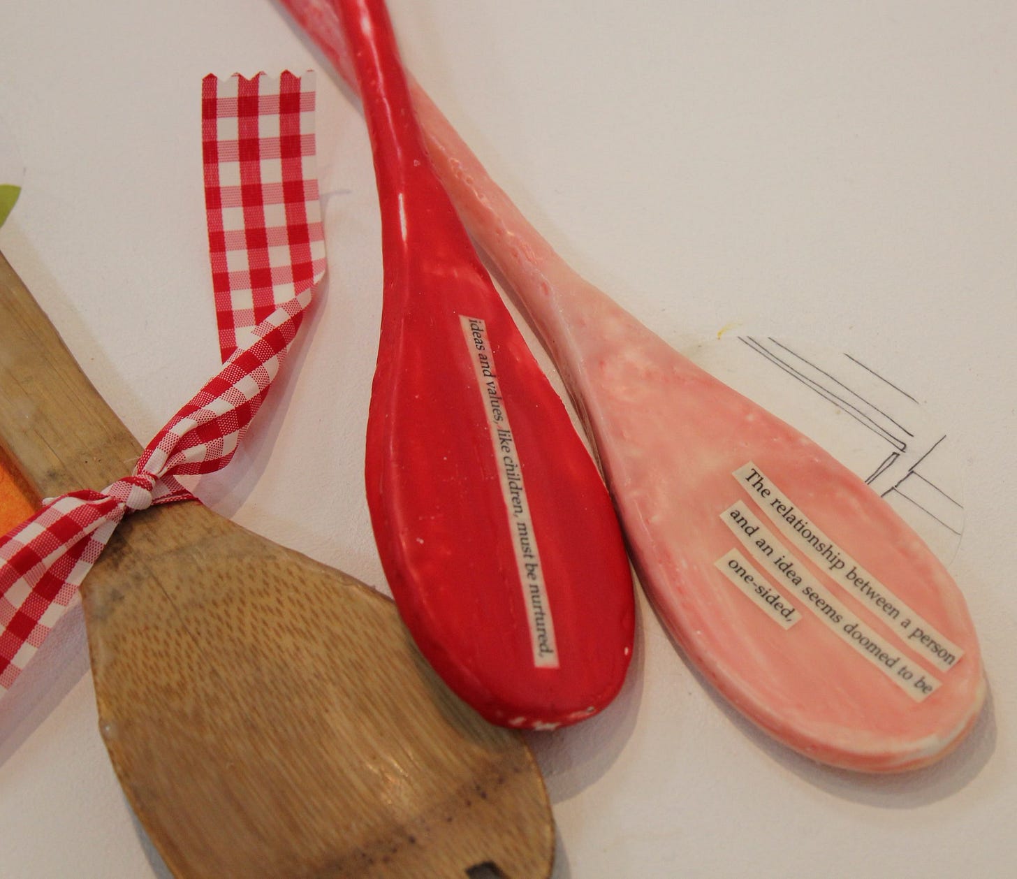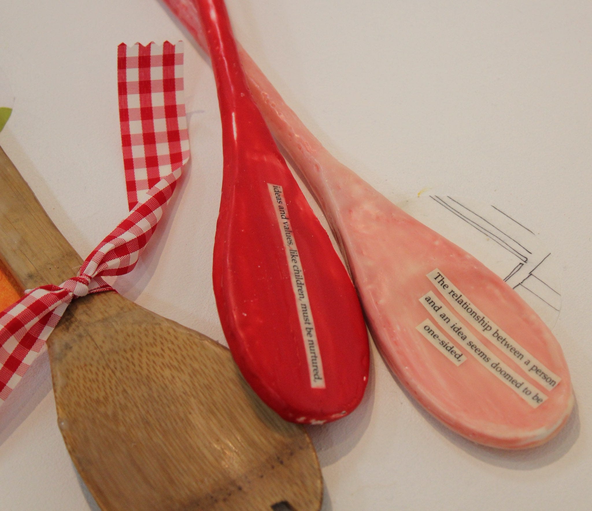 Once upon a time, I embellished a large number of wooden spoons. All it took was a cut-up book and encaustic (wax).