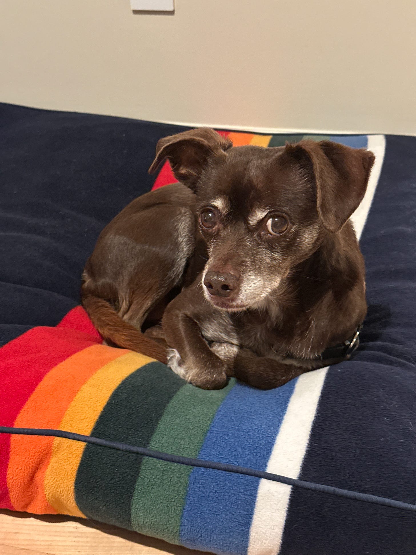 I say 11-ish because we do not know her actual birthday; we rescued her from a high-kill shelter in Los Angeles in 2014. She might be older or younger. She is wise. She tumbles down steps these days, but can also take long walks. She cannot see in the dark, but it never stops her. She’s missing teeth, and she eats in gulps. And, she naps. And naps. A lot.